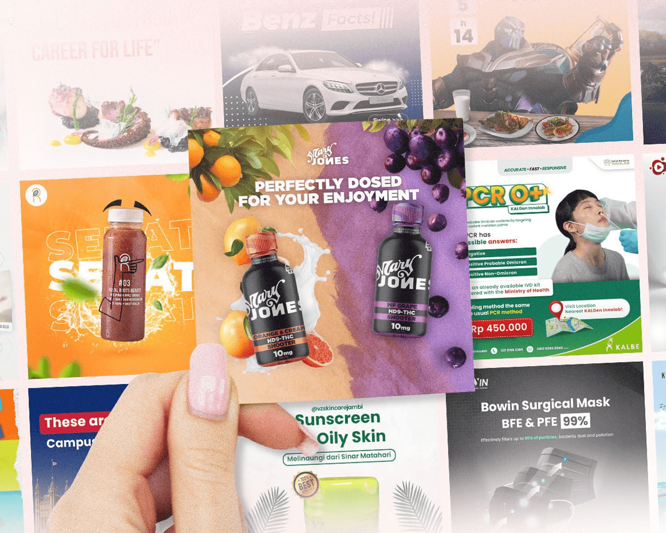 Carousels, statics, thumbnails, product visuals designed and delivered within your subscription.
